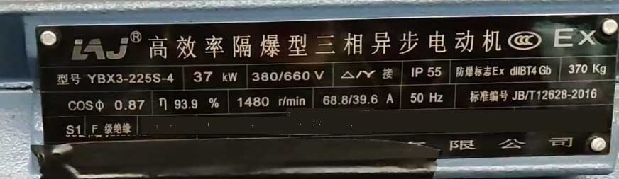 1、防爆電機型號:YBX3-225S-4防爆電機;Y:代表三相異步電動機,B:代表隔爆型;3:代表電機第三次設計;225:表示機座號,也就是防爆電機的中心高;S:表示短機座。